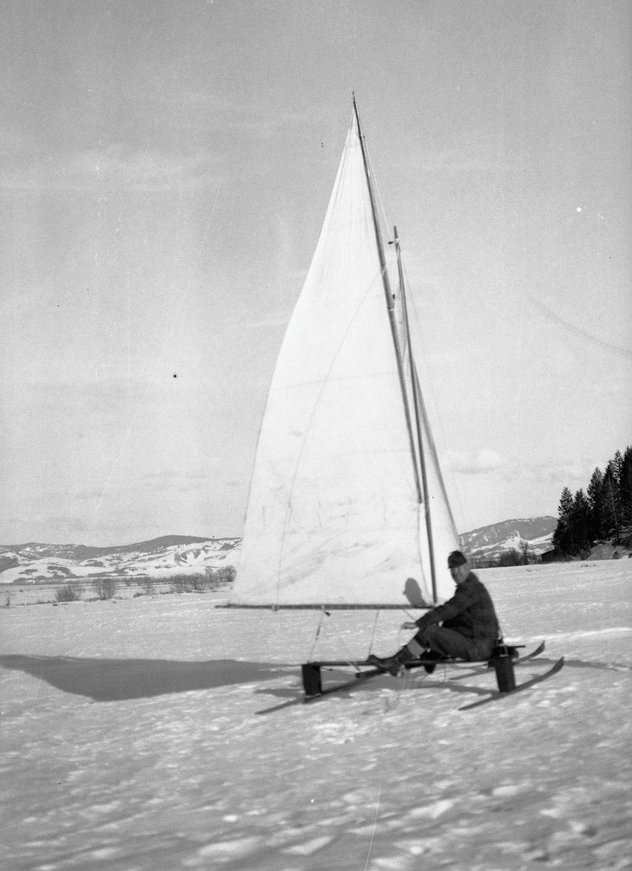 Likely Jackson Hole’s first and only sailing sled was built by Skipper Mapes. It was cleverly designed but this innovative approach to winter travel never caught on in the valley. Snow conditions and sustaining winds were never predictable.