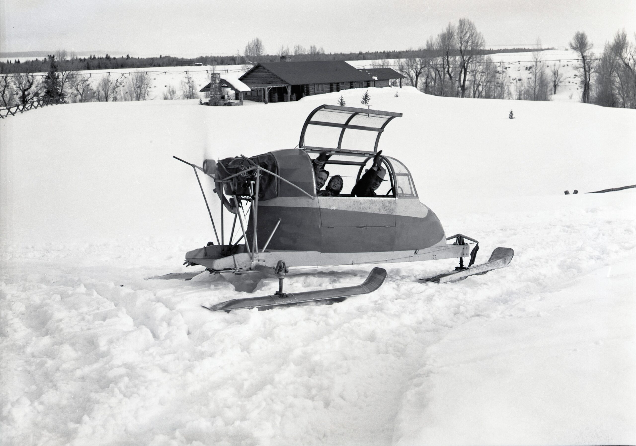 unique machine was equipped with an airplane engine mounted facing to the rear. It traveled on 3 skis arranged in a tripod pattern and could reach speeds of 70 mph with the right snow conditions. In the late 40’s, John lost 3 fingers on his right hand while trying to reach a shutoff switch with a run away snow plane,