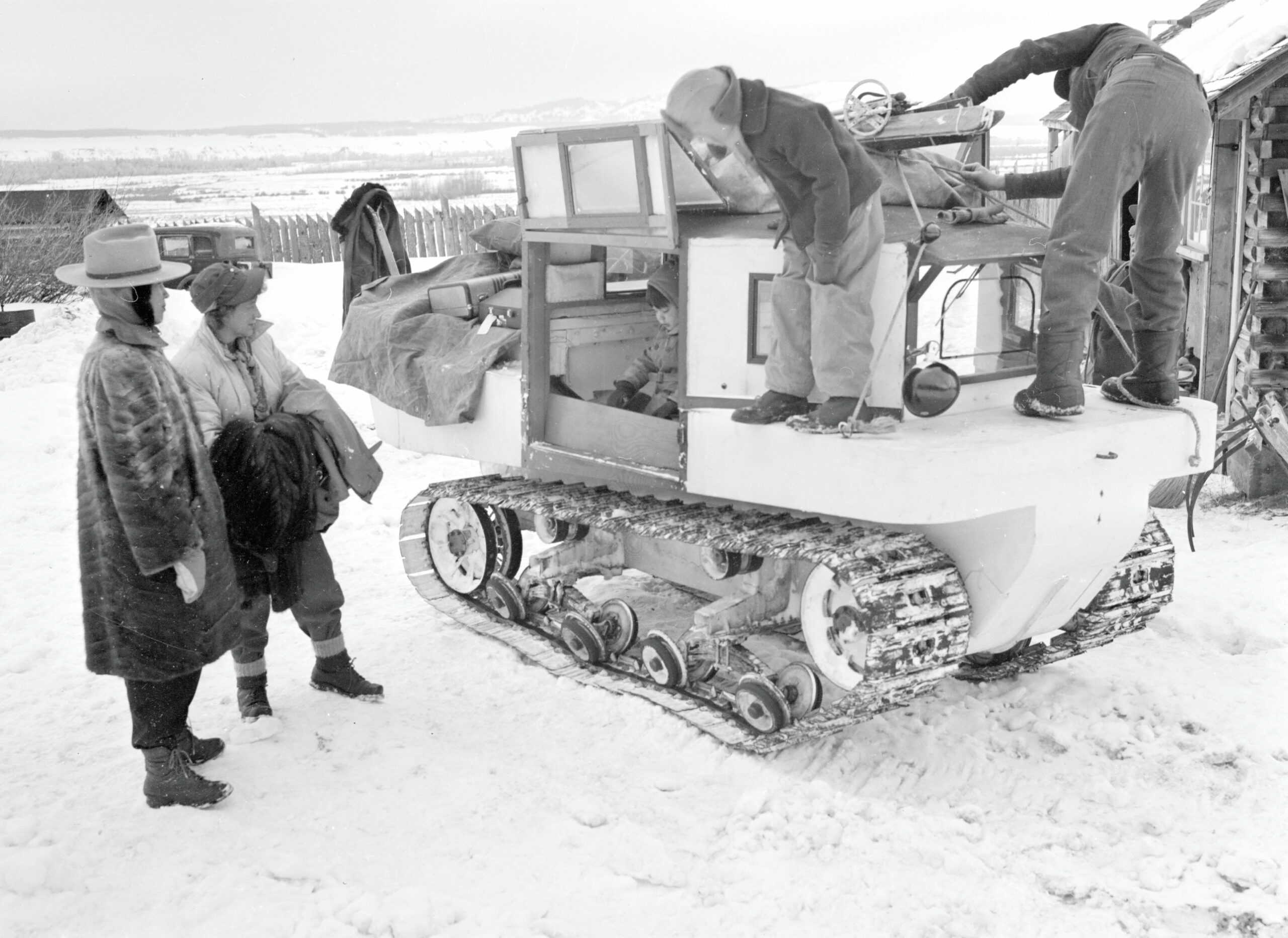 Some motorized vehicles were uniquely adapted for winter use. The Weasel was a WWII tracked landing craft that some configured for snow travel. One was made available to the Turners for a rare winter escape for a family vacation. Loaded with luggage and the family dressed in fancy apparel for travel, the Weasel caught fire and burned all the belongings. One of the most popular conveyances was the snow plane. With a homebuilt cab, this